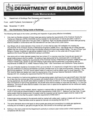 This code memorandum clarifies and puts into writing to all designers, installers, and inspectors what the City of Chicago requirements are for gas piping. The items noted in the memorandum incorporate the National Fuel Gas Code, along with industry standards for gas piping installation inside of a building.